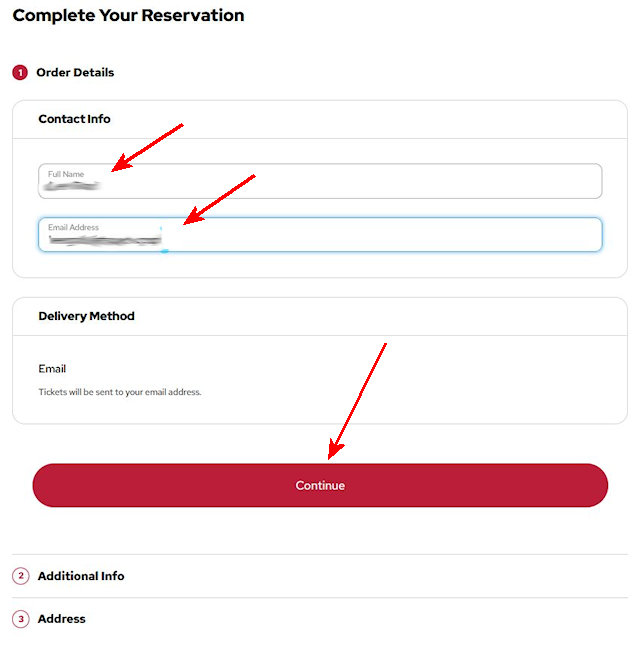 6. If you are getting additional tickets, fill out their information. Then, click on Continue.