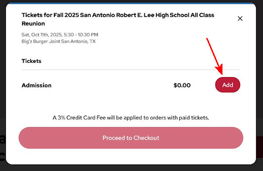 1. Click on the FREE Tickets link to take you to the event order page. Then click on Get Tickets.2. In the pop up window, click on Add.