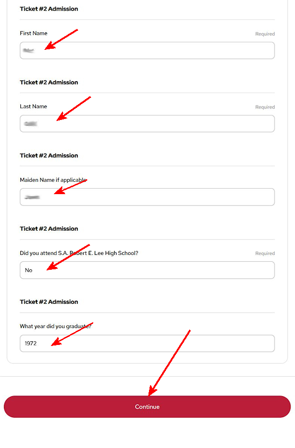 6. If you are getting additional tickets, fill out their information. Then, click on Continue.